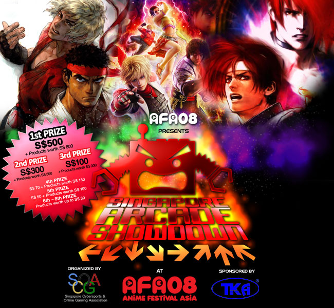 Singapore, 4 October 2008 – Anime Festival Asia 2008 (AFA08) will host the inaugural Singapore Arcade Showdown, a nationwide Arcade Gaming Competition organized by Singapore Cybersports & Online Gaming Association (SCOGA) and machines sponsored by TKA World. The landmark competition will take place in The Arena Zone, the seventh and newest Experience Zone of the AFA08 on the 22nd and 23rd of November 2008 at Suntec International Convention and Exhibition Centre.