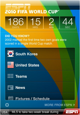 This summer, ESPN’s 2010 FIFA World Cup app will bring live scores, gamecast, scoring and news alerts and live audio streams from the competition that will see 32 national teams compete for the world’s prestigious, the World Cup! The app also features exclusive US and global news and analysis from ESPN and ESPNSoccerNet. It also includes extensive profiles of all 32 teams, players, tournament history and of course the full schedule! Click here to download this free app.