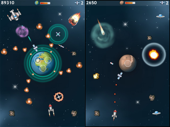 What makes Orbital Defender special is its unique tap-flick-drag-based control system. You can use various weapons by slightly different gestures. The result is a highly playable and fun shoot ’em up. There are 5 levels available in Lite version and 20 levels, new planets, new enemies, cool weapons, and OpenFeint integration in Full version. Check it out over here: https://itunes.apple.com/us/app/orbital-defender-full/id441064208?mt=8&ls=1
