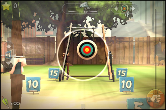 The game is presented in 3D, and the graphics look really great. The controls are simple enough, slide with one finger to draw the bow, tilt the iPhone to aim and you’ll need to compensate on distance and the wind. The wind part is rather tricky thing to deal with, but on the other hand, longer distances involve the arrow traveling in a curve, so just aim higher than the original target.